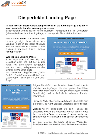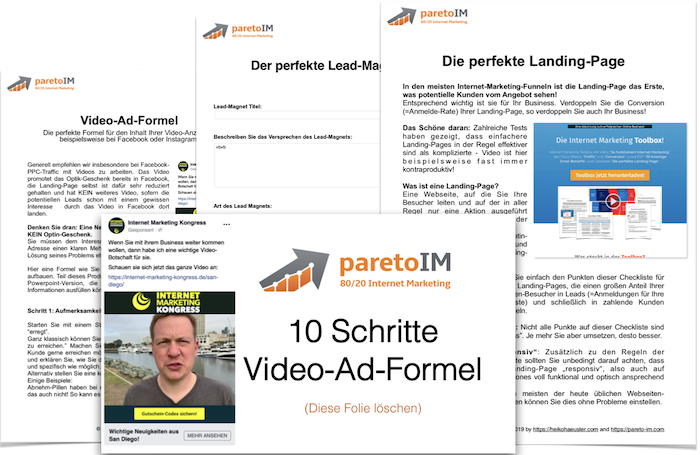 Internet Marketing Checklisten-Sammlung mit "Die perfekte Landing-Page", "Der perfekte Lead-Magnet" dem PDF "Video-Ad-Formel", sowie der Folien-Vorlage "10 Schritte Video-Ad-Formel"!